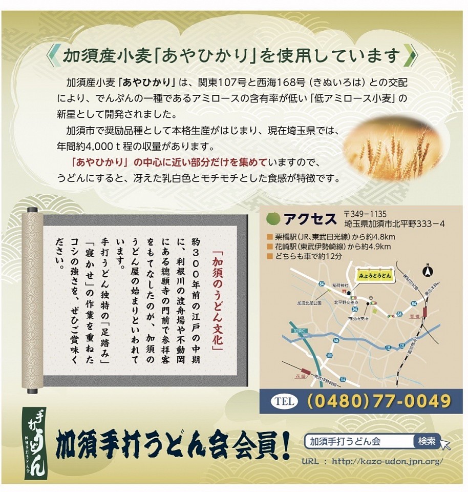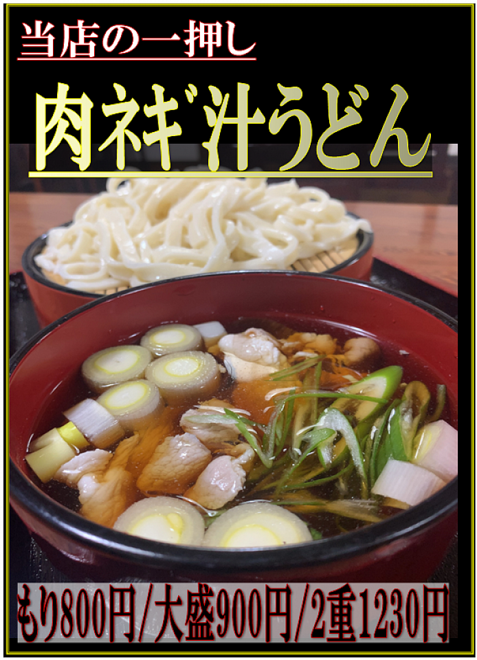 当店名物は、肉ネギ汁うどん !加須産地粉「あやひかり」使用の手打ちうどん店です。うどんは、「ツルツル」「モッチモチ」!ボリューム満点 名物のお肉たっぷりの「肉ネギ汁うどん+肉ネギ増し」もございます!まろやかな、カレーうどんも好評です!カレーつけ汁うどんも、ご用意しています。