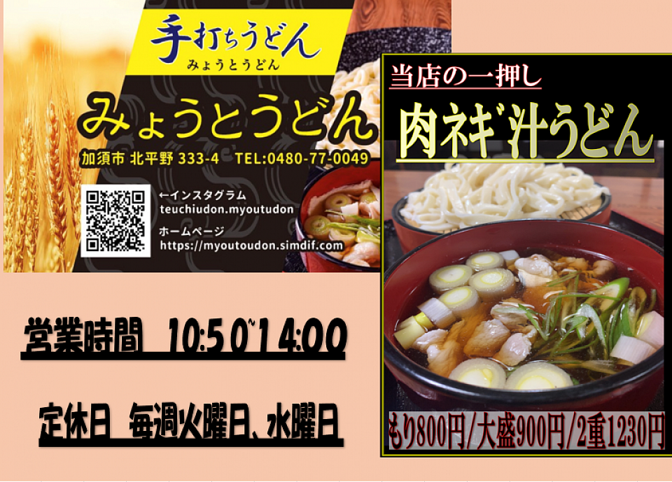 みょうとうどん 毎週火水曜日定休、営業時間 10:50〜14:00